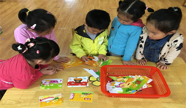 有的孩子在专心致志地拼着拼图,一边思考着一边把拼图放在合适的地方。有的孩子玩起了新式拼图,他一边拼一边细心地讲解,旁边的女孩子都被吸引了过来。还有的孩子玩起了迷宫游戏,智力拼板、穿泡泡项链......大家快乐而投入地玩着益智玩具,享受着游戏的快乐……