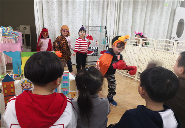 他们将多彩的丝巾变成头巾、披风、衣服、裙子、帽子……配上他们的万圣节帽子、南瓜灯、蜘蛛斗篷,穿上这些富有特色的服装即兴表演,真是有一种别致的愉悦感和新鲜感。美美的时装秀就这样开始了,小演员们自信满满,随着乐曲,迈着活泼轻快的步子,摆出各种优美而富有童趣的造型,小观众们热情洋溢、拍手鼓励,他们对美的感受和体验也得到真情流露。