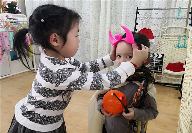 虽然我们不提倡过洋节,但是身边的一些娱乐场所、超市等环境中浓郁的万圣节氛围还是深深地影响着孩子们,他们忍不住在教室里谈论着爸爸妈妈们为自己购买的万圣节小饰品,为了满足孩子们兴趣需要,老师让孩子们把自己的万圣节小饰品带来,通过表演区里多彩的丝巾变装来完成自我装扮,将孩子们对万圣节的好奇情绪转变成热闹的表演区游戏。