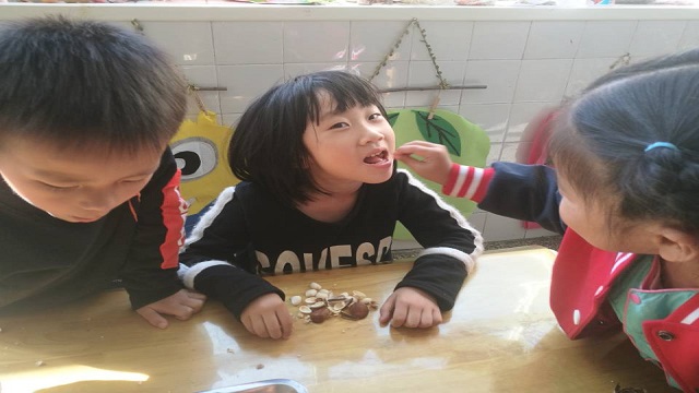 活动前期,幼儿和家长利用周末时间,共同收集各种各样的种子,充分感受在大自然中寻找种子的乐趣。在认识各类种子的基础上,幼儿带来了各种各样的种子食品。孩子们在认一认、讲一讲、尝一尝的过程中,知道了种子不仅可以种植、发芽、开花、结果,还可以加工成各种各样的食品。知道种子类的食物还包括五谷杂粮和坚果类,如:花生、核桃、瓜子等。他们还知道了有些水果的种子我们也可以吃,如:火龙果、猕猴桃、金桔等。瞧,孩子们吃的多开心啊!