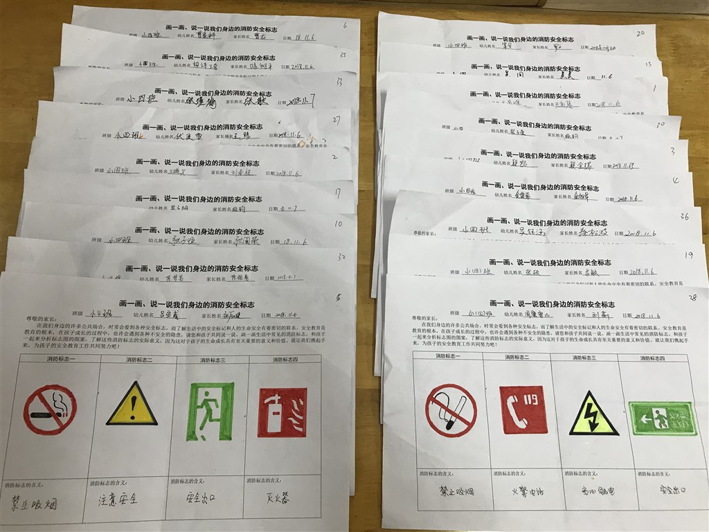 本周的教育主题是《画一画、说一说我们身边的消防安全标志》,动员全体家长积极参与,建议家长带着孩子一块到身边的代卖寻找各种安全标志、认一认,说一说这些标志的含义,家里和孩子一起画一画这些常见的消防标志,和孩子一起分析标志的图案,记牢标志的含义,提醒孩子在公共场所能主动发现这些安全标志。