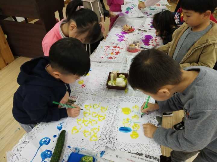 在活动中通过欣赏漂亮的示范画,小朋友们跃跃欲试,动手操作起来,有的孩子在印画的基础上进行添画,有用青椒印出花的,有用花菜印的,有用藕印的,最后再添画花茎和叶子;有的画完鱼缸和鱼再用蔬菜印出泡泡,有的画一个花瓶,再印出花,有的画一片草地和小动物,最后用蔬菜印出画作装饰,孩子们创意满满,都创出了漂亮的蔬菜印画。(审核人:陈洁)