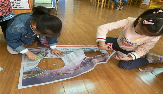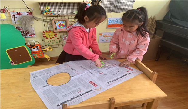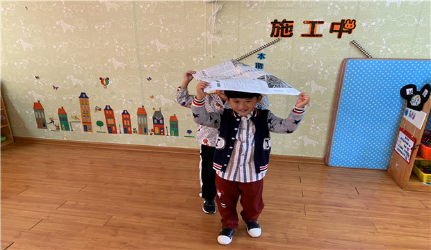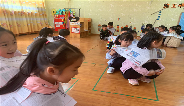 瞧,一张张的废旧报纸变成了孩子们游戏的好伙伴。两个人一起,商量的商量、制作的制作,将手中一张张报纸变成了小小“连体衣”,一起走、一起跳、一起蹲。下雨天,虽然没有了户外的空间,但是在孩子们想象下,孩子们还是能够快乐的进行游戏和锻炼。