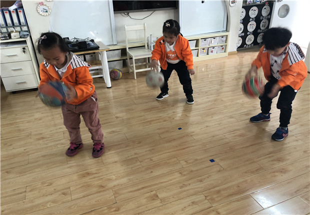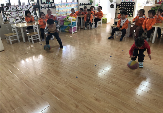 本次活动是以班级为单位,要求幼儿拍球的动作编排符合幼儿年龄特点,同时随音乐节奏完整的做动作。音乐响起,孩子们以饱满的热情积极应战,他们压低身子,眼睛直盯着皮球,个个不甘示弱,只见篮球乖乖地在他们手中上下跳动,同时身体随音乐节奏不断的变换方位,犹如百变魔术师。