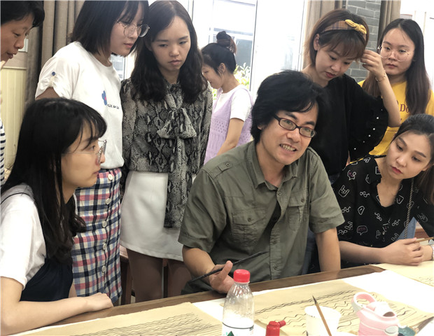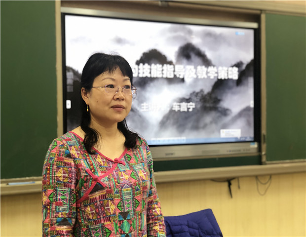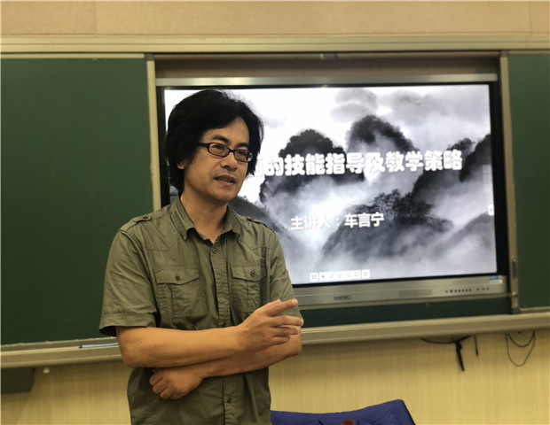 车老师本次就山水画作为重点培训内容,为我们带来了讲座《山水画的技能指导及教学策略》。从山水画的学习重要性和背景到如何去了解不同地区的地形地貌造就的自然环境的不同,再到临摹的学习技法一一道来。在实践环节,车老师又从一根线的运用开始分析笔墨的精到,然后为老师们边示范、边解说。老师们团团围在车老师旁边提问、边记录演示视频。接着,老师们尝试练手。大家拿起画笔,在宣纸上挥毫泼墨、直抒胸臆。车老师在巡回指导中,不时驻足,耐心、亲切地为老师们示范、提点。讲座在轻松温暖的氛围中,提升教师的水墨创作理念、创作技法。