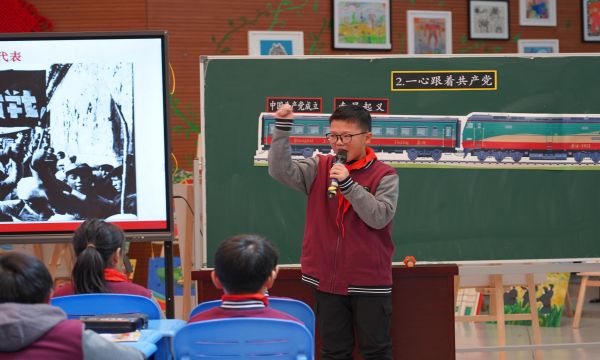 二十八年浴血奋战,中国共产党团结带领人民找到了一条正确的革命道路,实现了中国从几千年的封建专制政治向人民民主的伟大飞跃。站在2021年年末,何燕老师带领学生回顾中国共产党百年峥嵘岁月,将《读本》课与班队课的形式进行了横向统整。针对《读本》中“南昌起义”到“开国大典”的四段重大历史事件,何老师在课前设计了四个微“议题”,学生分组围绕议题展开了探究,并在课堂中运用“文物会说话”“身份穿越”“情景剧演绎”“创建红色场馆”等创意方式进行成果分享,老师适时抛出思辨性的话题与学生进行碰撞,师生一同沉浸式地“历经”了中国共产党二十八年的浴血奋斗。在课堂的不断推进下,学生对中国共产党领导人民站起来的历程更加清晰,对中国共产党永远与人民心连心的感悟更加深刻。