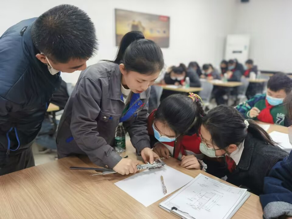 来到盛天传动,观看了企业宣传片,在生产部长刘部长的带领下,大家兴致盎然地依次参观了数控车间、研发中心,自动仓库……大家都兴奋不已,犹如打开了一个新世界,现场科学化生产线、精良的设备,让孩子们眼前大为一亮,对机器人自动化生产特别感兴趣。第一次看到那么多种链轮,同学们纷纷求教各种问题,朱经理为他们一一答疑解惑,还特意邀请精检员给大家介绍链轮外观特点,教他们如何规范使用游标卡尺,测量链轮相关外形尺寸。