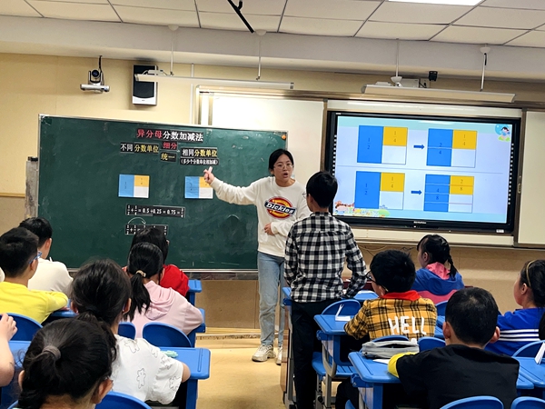 市综改课题《互联网环境下小学数学核心概念教学研究》核心成员于天娇执教《异分母分数加减法》紧扣核心概念“分数单位”展开深度教学,从几何直观到计算推理,算理和算法交融。最后,打通了整数、小数及同分母分数的加减法算理。体现了新课标的整体性和一致性。
