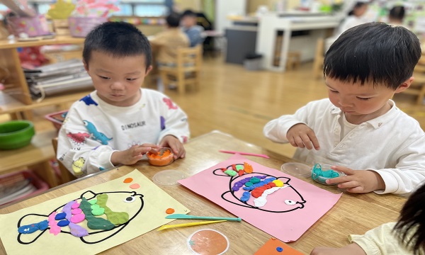 首先,我们和孩子们一起了解鱼的特征与习性,观察欣赏不同的鱼并学习如何照顾小鱼;接着,让孩子们用超轻黏土粘贴一条快乐的小鱼,孩子们根据鱼的特征用超轻黏土粘贴小鱼的鱼鳞,在粘贴的方法上,虽然跟以前差不多,但是没有了规律性的排列,这也考验了孩子们对粘贴的掌握,也是孩子们再一次的巩固。看小朋友们做的多认真,当孩子们通过自己的动手完成了某件作品时孩子们非常的兴奋与快乐,因为孩子们体验到了成功,感受到了制作过程中的乐趣!