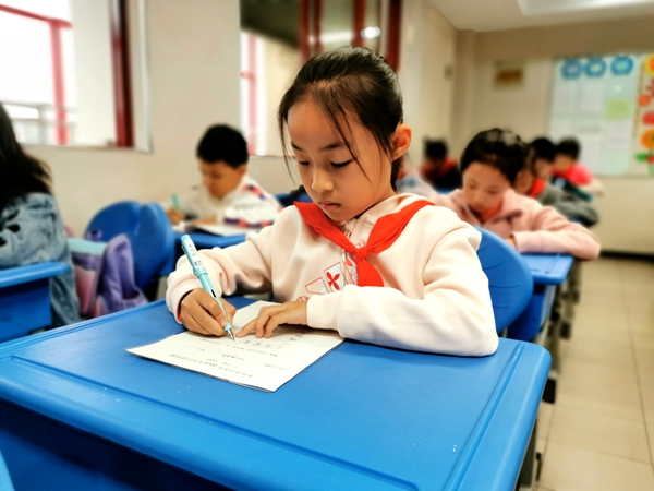 三(7)班的顾燕茹老师关注学生的执笔方法与写字姿势,让每一位学生过好执笔关。在书写过程中,老师通常会巡视指导,并通过学生自评、小组互评、全体交流、展示好作品等方式,激起学生书写的兴趣。