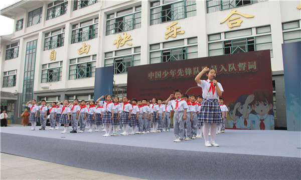 最值得一提的是,在这个特殊的日子里,伴随着火红的队旗、嘹亮的队歌、庄严的宣誓,一年级新生中第一批少先队员诞生了,学校党支部书记张岭以及教师、学生代表为他们佩戴上了鲜红的领巾。