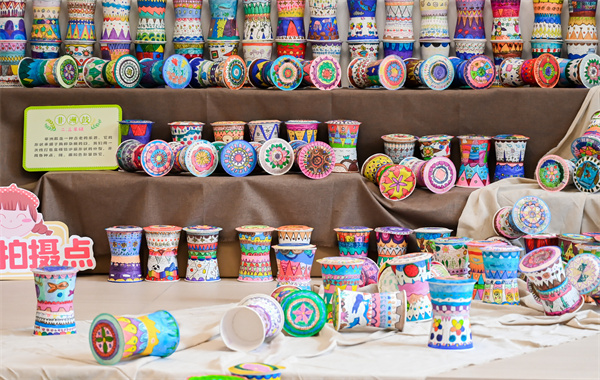 开幕式后,嘉宾朋友和红梅实小师生共同参观中非艺术展。在共享大厅,“丛林环绕”,一派非洲大草原生机勃勃的景象。仔细望去,在丛林环绕中,摆满了红梅实小孩子们亲手绘制的非洲主题创意作品:用打包盒仿制的“非洲鼓”,用颜色与线条装点的编织毯,用废旧纸箱表现的“非洲大草原”,还有纸浆画、染色头巾、图腾柱……精美的作品让人应接不暇。据介绍,学校每个孩子都参与了此次艺术展创作,每个孩子都能在展览中找到自己的作品,且每件作品都署有孩子的姓名,依次彰显“红梅花儿开,朵朵放光彩”的办学理念。