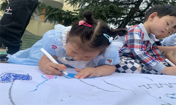 长长的画卷一字铺开,孩子们专注而认真地绘画着,在老师的带领下通过绘画形式表达对祖国妈妈的热爱之情,瞧!有的绘出雄伟的天安门,有的画出多彩的生日蛋糕。