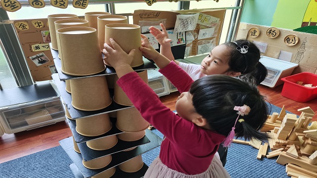 孩子们对建构材料的特征已有基本的认知,能用平铺、延长、垒高等技能搭建物体的基本造型,使用不同的建构技巧实现造型的平衡与对称,进一步实现造型的美观度。幼儿自己为自己所建造的东西的定义,使它成为现实世界中某种物体的象征性代表,复杂的造型还可多个孩子共同参与设计。孩子们从开始的无目的性且结构技能简单的单个建筑物搭建,逐步转换到有目的、有计划的分工合作搭建,从而达到自我学习、自我发现、自我探索和自我完善。