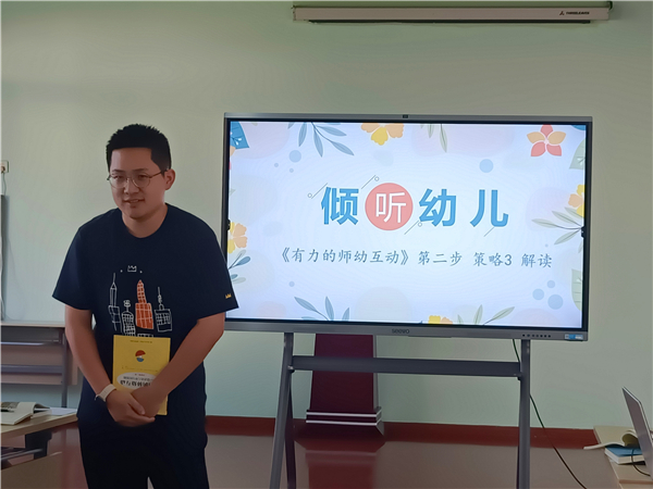 本次活动分别由徐予乐老师带来的策略一:慢下来,关注当下。当老师们放慢节奏,沉浸在这里的的一切,加入孩子们的每一个精彩的时光,静下心和孩子相处,过程中平视幼儿,花更多的时间和幼儿互动,了解幼儿深处;张超老师带来的策略二:持续了解幼儿。关键语:持续,了解。持续就是一个不间断的过程。了解,通常是用来形容对某件物或某件事的掌握领悟程度,放到我们的工作中,就是对幼儿的了解;杨子豪老师的策略三:倾听幼儿。在听的时候,会思考,会记录,会肢体的拥抱。所以,倾听不仅仅是听到,它是指决定去关注幼儿通过口头语言和肢体语言传达出来的信息,并探寻它们的意义;刘琪老师进行分享的策略四:让互动适合幼儿的个性化特点。每一位幼儿都是独立的个体,孩子们的性格都不一样,不同的建议适合于不同的幼儿,在平时与幼儿沟通时要把每个幼儿当作个体来对待。首先是取决于对幼儿的了解程度来说。