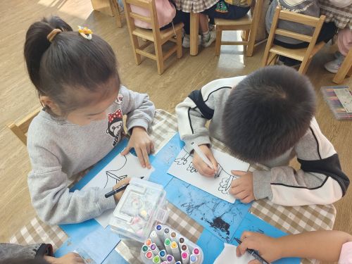 孩子们叽叽喳喳地说着各自的发现。都迫不及待的想要来画一画这美丽的树林。于是小朋友们马上拿出画笔 将心中的树林绘画出来。瞧,他们从叶子的交叠、色彩的变化等方面将秋天的树林表现得淋漓尽致。作品完成啦,一幅幅近近远远的大树,一片片色彩斑斓的树林呈现在我们眼前,树林上的树叶有黄色的、橙色的、红色的,还有一些绿色的.....可真好看呀。