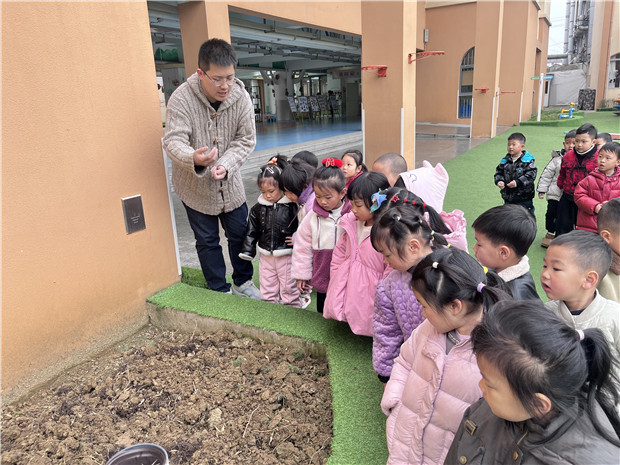 首先,老师带领幼儿来到幼儿园的种植区。在这里,幼儿指着绿油油的菜苔,惊喜的在里面寻找开出的小花。接着小朋友们又欣赏着校园里已经开放的鲜花,有白白的海棠花,有粉粉的桃花。孩子们纷纷发出赞美的声音“哇,太美了”。教师则一边带领幼儿欣赏,一边向幼儿介绍。