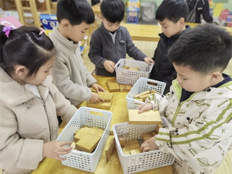 《3—6岁儿童学习与发展指南》中指出:“幼儿的科学教育是科学启蒙教育,重在激发幼儿的认识兴趣、探究欲望,帮助幼儿学习运用观察、比较、分析、推论等方法进行探索活动。”2024年4月18日,茶山中心幼儿园果果一班教室里热闹非凡,小朋友正在进行“小小建筑师”的搭建游戏。