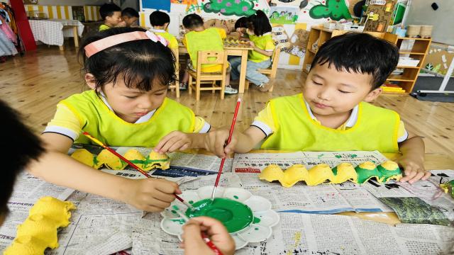 作为端午节的重要习俗,集观赏性和趣味性于一体的龙舟比赛激起了孩子们的兴趣。孩子们就是最富创造力的设计师,总能用独特的方式来表达热爱。在观看了赛龙舟视频,孩子们开始动手用蛋托制作龙舟。先给蛋托刷上颜料,再在两边插上棉签,作为龙舟的桨,最后在画上眼睛鼻子等表情或加一点装饰,一条条可爱俏皮的龙舟就完成啦!