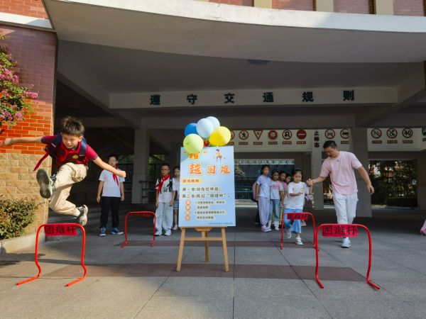 “乒”尽全力,运球至“快乐桶”,预示新学期收获快乐与成长;迎“篮”而上,将球投进“幸运筐”,寓意好运连连;“跨”越困难,跃过“困难杆”,展现勇气和坚韧;“拳”力以赴,击打“烦恼柱”,象征将心中的烦恼与忧虑一一击碎……