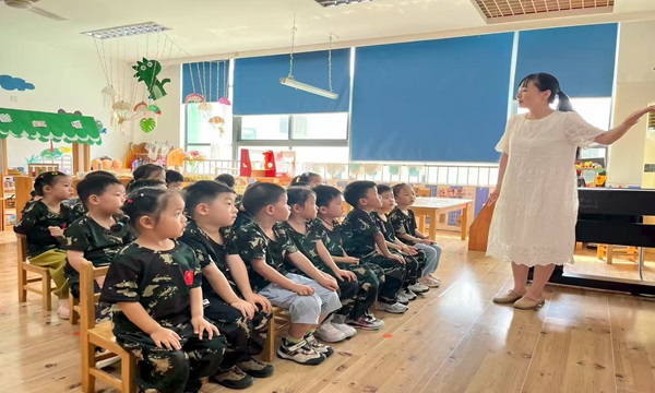 “以前有坏人想欺负我们,但中国人特别勇敢,一起努力保护了我们的国家。”中班老师一边展示英雄故事的绘本,一边向孩子们解释道。小朋友们睁大眼睛认真聆听,纷纷举起小手说:“我也要当小英雄!”“我们要爱自己的祖国!”随后,孩子们在老师的带领下学唱爱国儿歌,用稚嫩的方式表达对祖国的热爱。以直观、温和的方式帮助孩子建立民族记忆的初步认知,让爱国种子在童心中生根发芽。”
