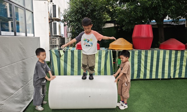 初次玩滚筒,孩子们按照自己的计划,开启了滚筒带来的快乐初体验。他们在自由的游戏中,和滚筒进行了一些有趣的互动。推滚筒、钻滚筒、坐在滚筒里......他们用自己的方式,动手动脑探索不一样的滚筒玩法。在初步探索阶段孩子们对滚筒产生了极大的探究兴趣,并根据自己的兴趣不断尝试新的玩法,每个孩子的发展能力不一样,表现出的方法不一样,但是他们都很快乐,也很投入。幼儿的兴趣与好奇心的保持是短暂的,容易转移。当幼儿对游戏失去兴趣的时候,同伴间的互相学习尤为重要,其中一位幼儿站上滚筒无疑给他们带来了新鲜感。通过互相合作的方式能够站在滚筒上了,经过不断地练习,建立安全感,难度的提升,不同的玩法,孩子们竟然能在筒上走了起来。有了成功的案例,越来越多的宝贝大胆尝试起来,虽然刚刚尝试遇到很多困难和问题,但是有了同伴、老师的引导,很快就获得了有益经验。