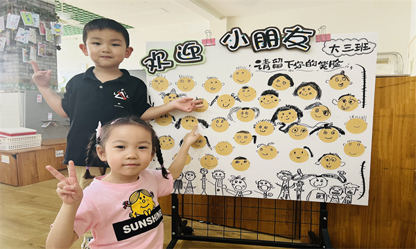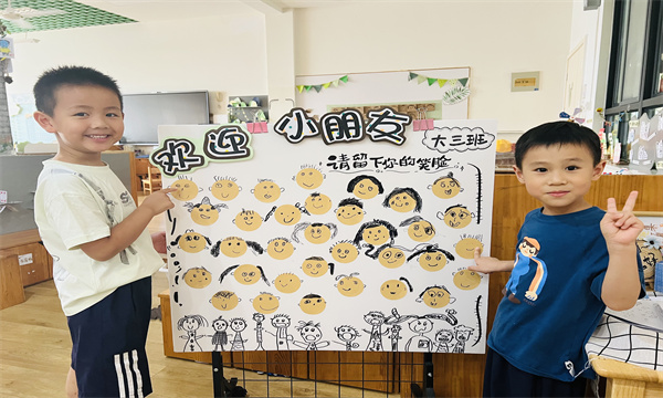 欢迎展板上,孩子们用充满童趣的笔触绘制自己独一无二的笑脸,这34张萌趣自画像组成了我们温暖的大合照。