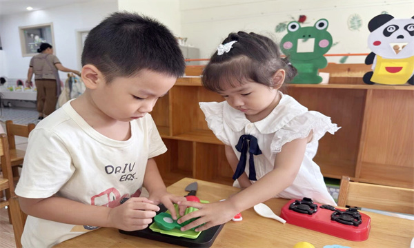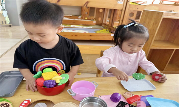 活动中,孩子们化身 “小厨师”,围绕着各种色彩鲜艳、造型逼真的玩具厨具和 “食材” 忙碌起来。有的孩子专注地用玩具刀具 “切” 着 “蔬菜”“水果”,将它们小心翼翼地摆放在盘子里;有的孩子则拿着小锅、小铲,有模有样地 “翻炒”“烹饪”;还有的孩子相互合作,一起 “准备食材”“制作美食”,脸上洋溢着认真又快乐的神情。