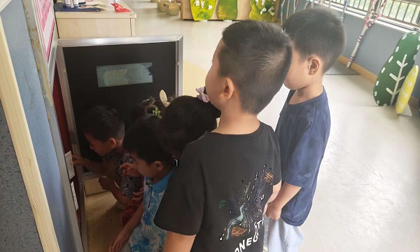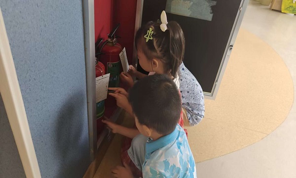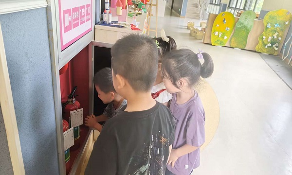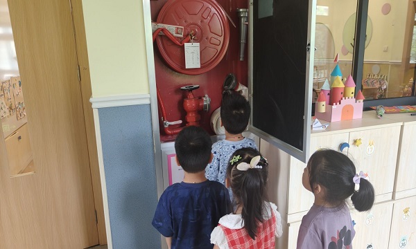 活动过程中,孩子们围在教室内的消防设施柜前,专注地研究消防栓、灭火器等设备。在教师的引导下,他们仔细观察消防柜内的构造,辨认设备功能,甚至用手指着灭火器上的说明卡片互相讨论。画面中,孩子们神情认真,仿佛化身为“小小消防员”,对消防设备充满了好奇与探索欲。