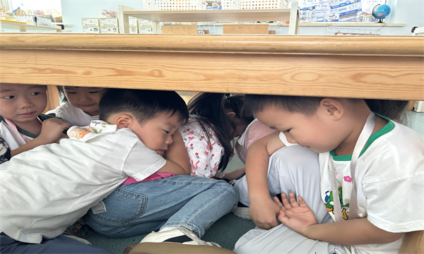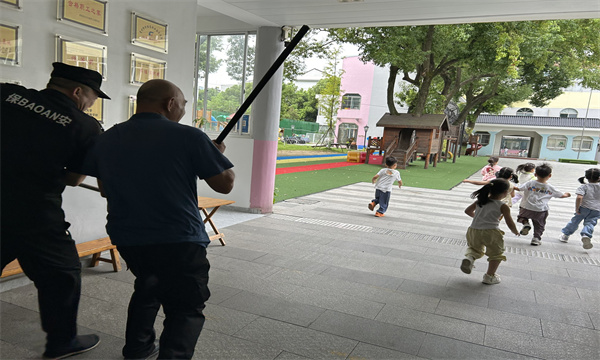 听到警报后,全园师生迅速启动应急预案。在户外活动的老师以最快的速度组织幼儿返回最近的室场,紧闭门窗,拉上窗帘,关灯,然后用桌椅堵住门,防止“暴徒”闯入班级,并拿起一切可以还击的武器以防暴徒进班伤害幼儿。与此同时,安全应急小组成员也在警报响起后迅速到场,和安保人员一起拿起警棍、钢叉等器械冲向“暴徒”,对“暴徒”进行围堵拦截。最后在大家的合力下,“暴徒”被制服,各班教师对幼儿人数进行清点上报,确保无误后,幼儿园宣布解除警报。