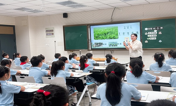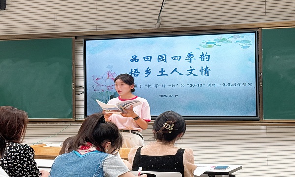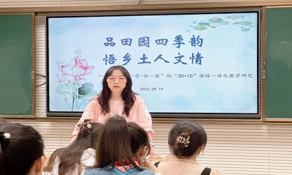 王棵老师执教《田家四季歌》。课堂上,王老师语气亲切,通过生字教学、词语理解、农事介绍等环节逐一实现教学目标,既关注基础能力,也注重情感表达,有效促进学生的语言发展与情感体验。课堂中王老师还联系古诗《乡村四月》进行文化拓展,增强学生的文化认同与情感共鸣。让学生不仅在语言实践中积累了知识,更在情感共鸣中提升了语文素养。