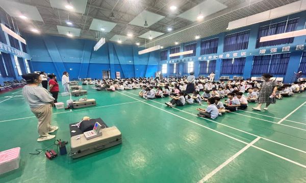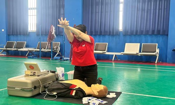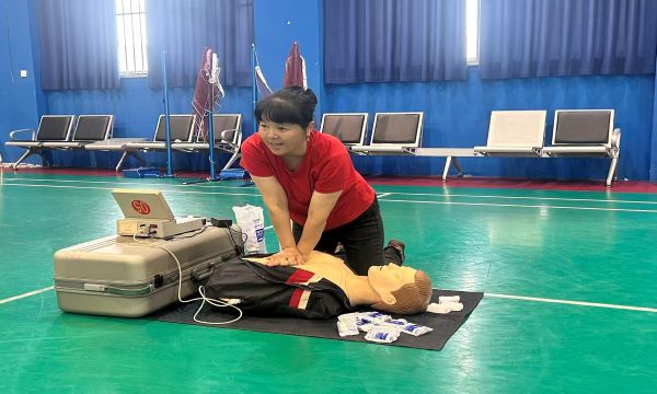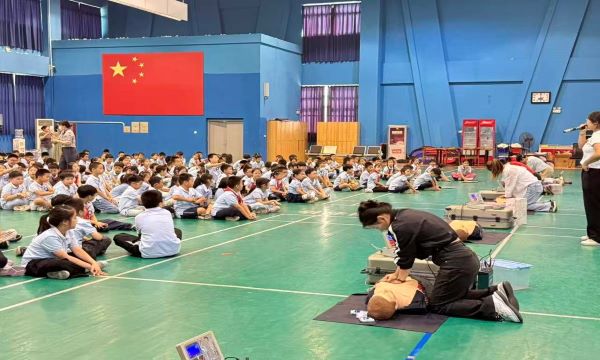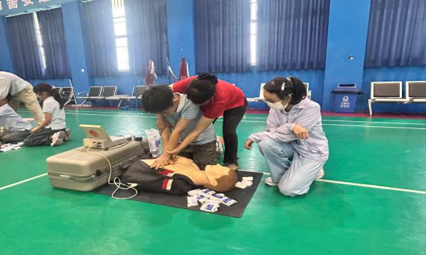 当天的活动亮点当属心肺复苏现场学习与体验环节,该环节在学校三楼体育馆有序进行。活动按照年级分时段开展,每个班级都配备了一台智能人体模型,专业急救员首先详细讲解了心肺复苏的重要性、操作步骤和注意事项,随后进行了标准的示范操作,从判断意识、呼叫急救到胸外按压、人工呼吸,每一个动作都讲解得细致入微。