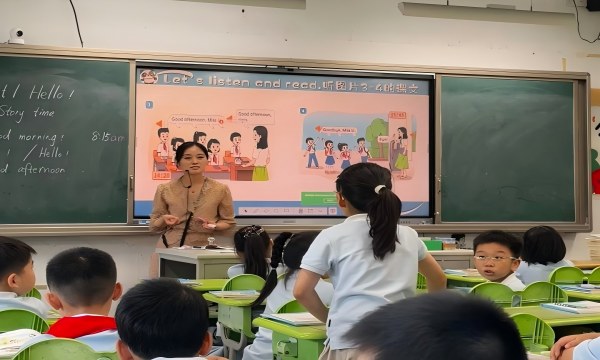 首先,所有老师相约三2班,共同观摩了蒋来老师的课堂。蒋老师以生动活泼的字母儿歌导入课堂,通过情境创设、互动等方式,引导学生学习问候语。在新知识的教授过程中,蒋老师渗透多种表达方式,丰富学生的语言,创造良好的英语语境,学生跟读积极。在课文教学时,她注重语音语调的模仿和真实交际能力的培养,利用多媒体课件和头饰道具激发学生兴趣,课堂气氛热烈,学生参与度高。