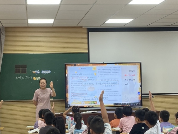 随后,苗花老师执教的《秋天的雨》以清晰的板块设计赢得了在场教师的广泛好评。课堂围绕 “我把秋雨读成诗”“我把秋雨话成诗”“我把秋雨写成诗” 三大板块层层递进,环环相扣。在 “读成诗” 环节,苗老师引导学生通过多种形式的朗读,感受文本语言的韵律之美;“话成诗” 环节中,她鼓励学生结合生活体验畅所欲言,用自己的语言描绘秋雨的灵动;“写成诗” 环节则聚焦表达实践,让学生在模仿与创作中提升语言运用能力。整个课堂逻辑清晰,梯度分明,充分展现了苗老师扎实的教学功底与精巧的教学设计能力。