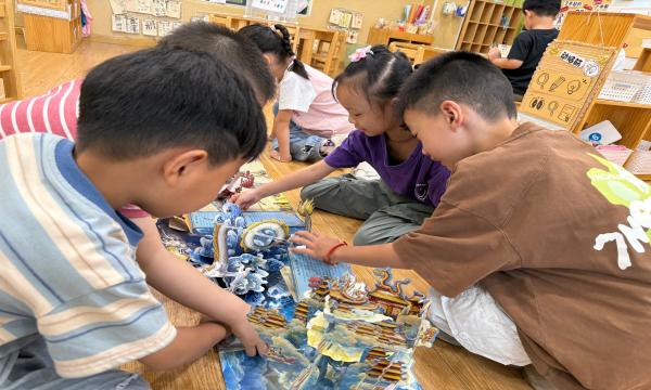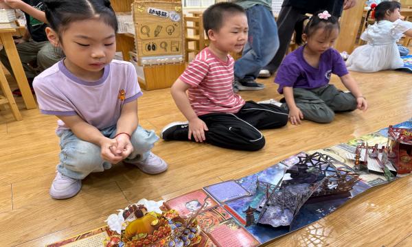 孩子们从家里带来了《西游记》3D书和伙伴们分享,他们在长长的画卷前,好奇的观察,讲述自己看到的故事场景。在分享与倾听中锻炼表达能力,激发想象力,让阅读的种子开出绚丽之花。