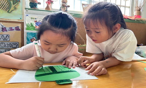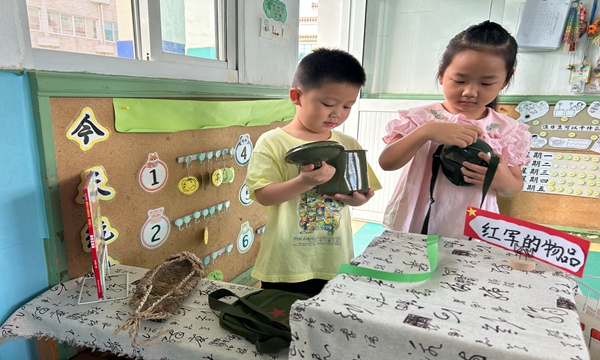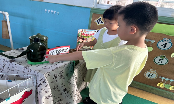 孩子们前期参观了澄西抗日民主政府旧址纪念馆,对里面的老物件比较感兴趣。于是家园共同收集了革命老物件,如军用水壶、草鞋、行军挎包、搪瓷杯等。每一件物品,都承载着历史的记忆与岁月的痕迹。在老师的引导下,孩子们兴致勃勃地围在一起,仔细观察这些老物件。有的触摸草鞋的粗糙、有的模仿搪瓷杯喝水等互动,直观感受到物品特征。孩子们积极与老物件“对话”,通过“角色扮演”的方式,生动形象的展示老物件的使用方法,体会到红军坚韧、勇敢、无畏的精神。区域游戏时间,美工区的孩子们还根据军用水壶的样子进行绘画创作,激发他们的想象力和创造力。
