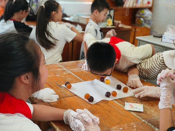 在制作环节,孩子们在牟滢绮妈妈的耐心指导下大显身手。揉制冰皮、擀成圆皮、挑选馅料、包馅塑形,再小心翼翼地放入模具中按压成型……每个步骤都充满挑战与惊喜。有的孩子初次尝试,皮儿总是擀不圆,身旁的小伙伴立马化身“小老师”,手把手分享技巧;有的孩子包馅时馅料“调皮”地露了出来,引得周围笑声连连。经过一番努力,一个个造型精美、圆润可爱的冰皮月饼新鲜出炉,孩子们捧着自己的作品,脸上洋溢着自豪的笑容。