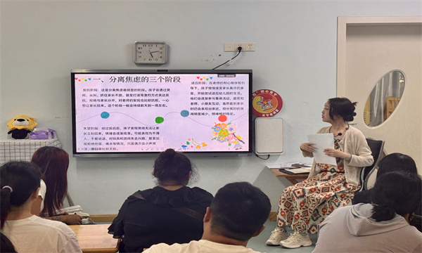 活动中,老师围绕分离焦虑的三个阶段展开详细讲解,反抗阶段:孩子会通过哭闹、尖叫、紧抓家长等激烈方式表达抗拒,这一阶段通常持续数天到一周左右;失望阶段:孩子情绪逐渐低落,可能出现不理人、对游戏失去兴趣甚至拒绝进食等情况;适应阶段:在老师的耐心陪伴下,孩子慢慢接受家长离开的事实,分离时的哭闹明显减少,开始尝试参与集体活动。同时,老师还深入分析了分离焦虑产生的原因,包括宝贝对新环境的不适应、生活规律的改变以及安全感的暂时缺失等。现场家长们认真聆听、积极记录,不少家长还结合自家宝贝的情况提出疑问,老师一一给予专业解答,现场互动氛围十分热烈。