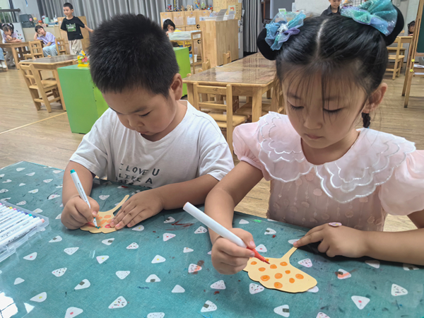 活动伊始,孩子们在老师的引导下观察真实银杏叶的形态与脉络,随后拿起安全剪刀,将棕色卡纸化作"魔法画布"。剪出银杏叶的形状。随后,彩笔、水粉齐上阵,金黄的落叶上跃出彩虹、星星、笑脸等童趣图案,更有孩子将秋日收获的果实、小动物等元素融入创作,让叶片成为会讲故事的"秋日信使"。