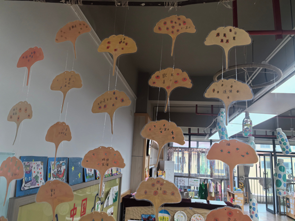 完成创作的"银杏林"并未止步于桌面。当一片片独一无二的"秋叶"从天花板垂落,教室瞬间化作流动的金色海洋。阳光透过窗户洒在叶片上,光影交错间,连空气都弥漫着甜甜的秋日气息。