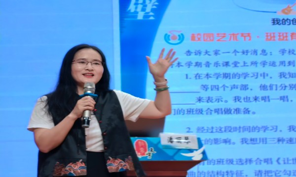 新教材构建了知识、能力、能力三重体系,推动教师从“教什么”转向“学生能做什么”,潘老师提出教学目标须具象可评。她强调“以学习者为中心”不是口号,而是要将课堂转化为学生问题的真实场域,让核心素养在观察、实践、反思中落地生根,实现教学评一致性。 实践为本:沉浸式课堂,让音乐回归体验本源
