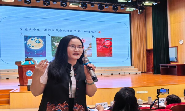 潘老师强调音乐教学需“感性体验先行,理性认知跟进”。她结合不同学段的优秀课例,既给出教学实践的参考范例,又构建起助力教学落地的“脚手架”,不仅帮教师打通“理念到实践”的衔接堵点,更打开了教学实践的创新思路。