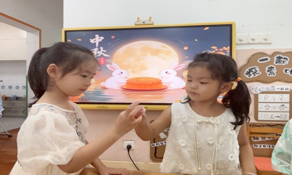活动现场处处是节日的氛围:孩子们带着小红旗贴纸,在欢快的氛围中开启活动。“国旗下的祝福”环节,孩子们跟着老师学唱爱国童谣,用稚嫩的歌声表达对祖国的祝福;“中秋故事会”里,老师通过动画和绘本,生动讲述嫦娥奔月、月饼由来的传说,让孩子们了解传统习俗。