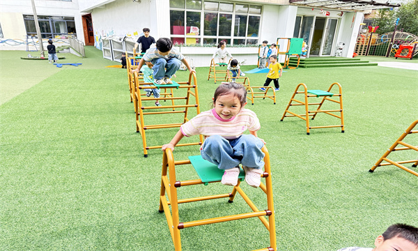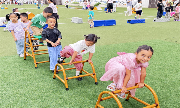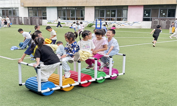为贴合不同年龄段幼儿的运动能力,幼儿园精心规划了分层活动:大班孩子围在彩色滚筒车旁,三五个小伙伴手拉手站在长条滚筒两侧,跟着老师的口号一起抬脚、发力,看着彩色滚筒“咕噜咕噜”向前滚动,小脸上满是兴奋,在协作蹬踩中锻炼了下肢力量与团队配合;中班孩子则骑着五颜六色的脚踏车,在划定的路线上自由骑行,有的放慢速度欣赏周围伙伴的玩法,有的加快脚力和同伴比拼,清脆的笑声随着车轮转动不断传开;混龄区孩子的活动更具挑战性,一部分钻进大型钻爬设施,弯腰钻过“山洞”、抬腿跨过“障碍”,灵活的身影在设施间穿梭;另一部分则围在户外积木区,你搬一块大积木、我搭一根长支架,分工合作搭建出“小房子”“高架桥”,在动手实践中培养空间思维与解决问题的能力。