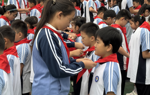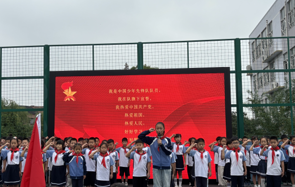 “我是中国少年先锋队队员!我在队旗下宣誓:热爱中国共产党,热爱祖国,热爱人民,好好学习,好好锻炼……”大队长魏文婧带领新老队员举起右拳,铮铮誓言响彻校园。阳光洒在孩子们紧绷的小脸上,也洒在他们胸前飘扬的红领巾上,将“为共产主义事业贡献力量”的承诺,深深镌刻进成长的年轮。