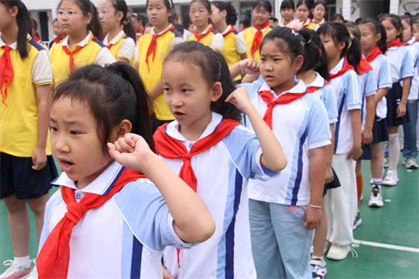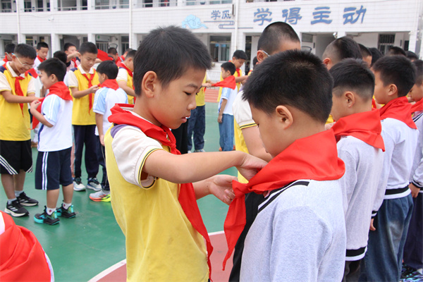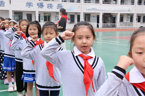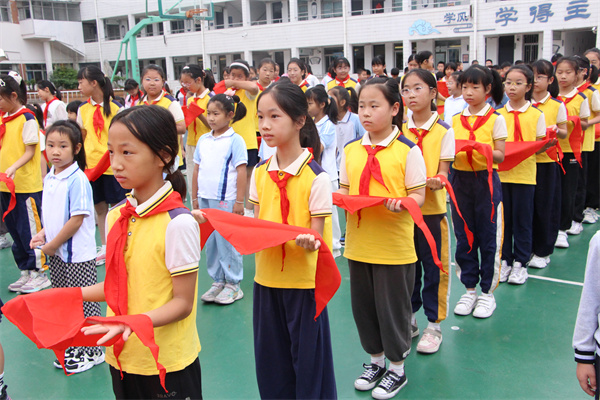 五年级的优秀少先队员们手持崭新的红领巾,有序走到新队员面前。他们细心地为新队员们系上红领巾,每一个步骤都饱含着 “老队员” 对 “新队员” 的期许。在大队长胡语涵的带领下,新队员们高高举起右手,眼神坚定、声音铿锵,将铮铮誓言融入校园的晨光里。这誓言不仅是对组织的承诺,更是他们未来成长的行动标尺。