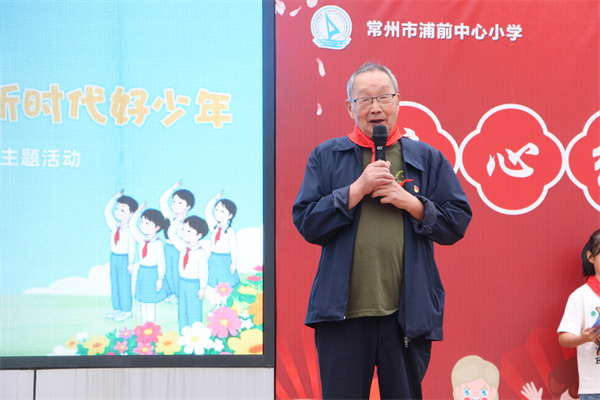 人民新家园社区的老党员卢新正爷爷受邀为仪式讲话。他首先向新队员们表示祝贺,随后讲述自己的入党故事,鼓励队员们从小爱党向党,长大为党和国家做贡献。