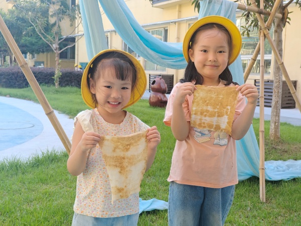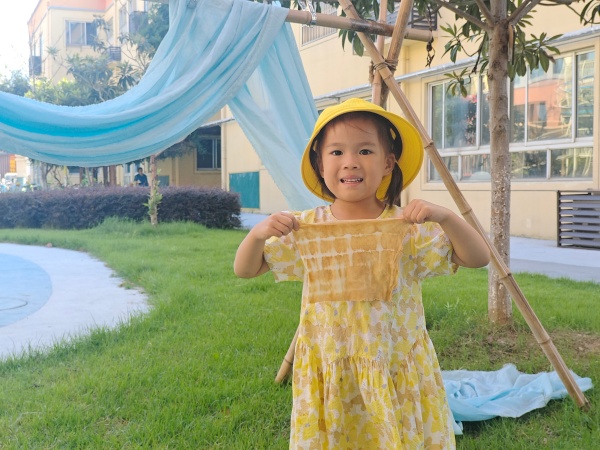 每一次展开,都伴随着一声声惊喜的欢呼。这次我们摒弃了其他染料,只专注于泥染。这不仅能让孩子最直观地感受‘大地颜料’的魅力,理解最古老的染色智慧,更能让他们在纯粹的触觉体验中,摆脱对‘脏’的刻板印象,建立与自然材料的深厚情感联结。