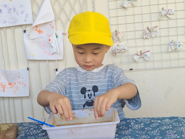 没有缤纷的颜料,只有一团团质朴的泥土;没有复杂的工具,只有一双双充满好奇的小手。2025年10月14日,郑陆中心幼儿园中二班的孩子们沉浸在一场返璞归真的艺术体验中,他们仅用最天然的泥浆,亲手染出了独一无二的“大地之色”手作。