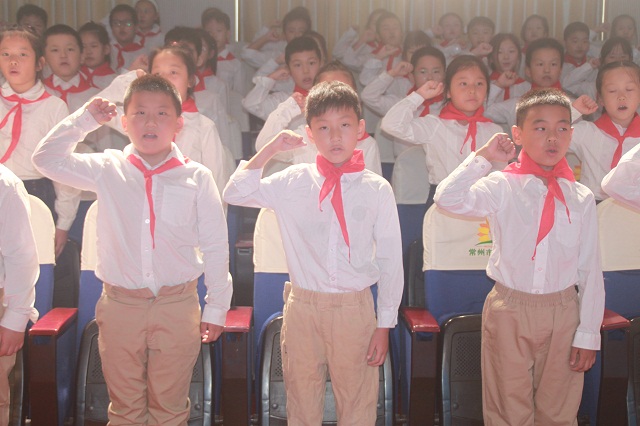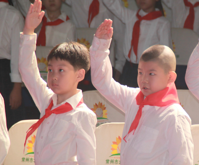 “我是中国少年先锋队队员。我在队旗下宣誓:我热爱中国共产党,热爱祖国,热爱人民,好好学习,好好锻炼,准备着:为共产主义事业贡献力量!”在大队委吴千毓的带领下,新队员们高举右拳,面向队旗庄严宣誓,稚嫩的声音坚定有力,字字句句都是对未来的郑重承诺。